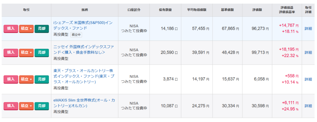 下の画像は、ワイの【つみたてNISA】のリアルな状況や!4つの商品を購入してるんやけど、実際に買ってるのは、【S&P500】か【全世界株式】の2種類や!